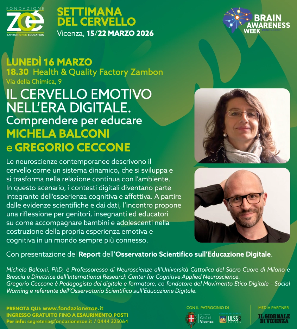 Si pubblica la locandina dell'incontro 'Il cervello emotivo nell'era digitale - Comprendere per educare', con la prof.ssa Michela Balconi e con il pedagogista digitale Gregorio Ceccone, previsto per lunedì 16 marzo, ore 18.30, a Vicenza in via della Chimica 9 (presso la Health & Quality Factory Zambon).