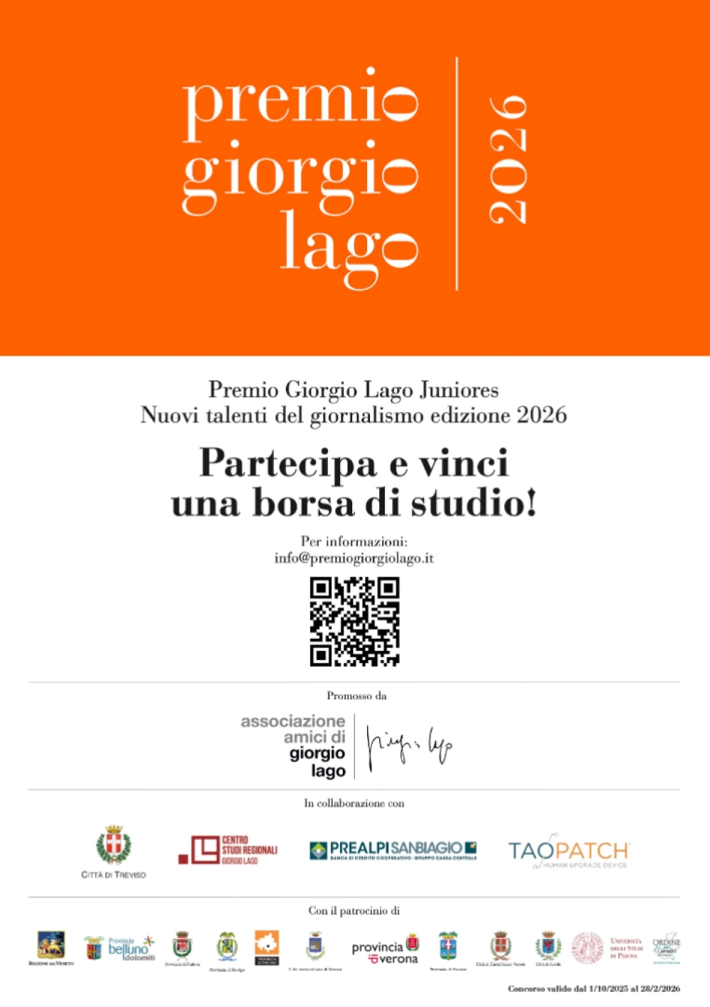 Si precisa che i maturandi degli istituti superiori del Veneto e del Friuli Venezia Giulia hanno tempo fino al prossimo 28 febbraio 2026 per provare a vincere una delle tre borse di studio destinate ai migliori elaborati e il premio ex aequo riservato alle scuole messi in palio dal Premio Giorgio Lago Juniores - Nuovi talenti del giornalismo.
