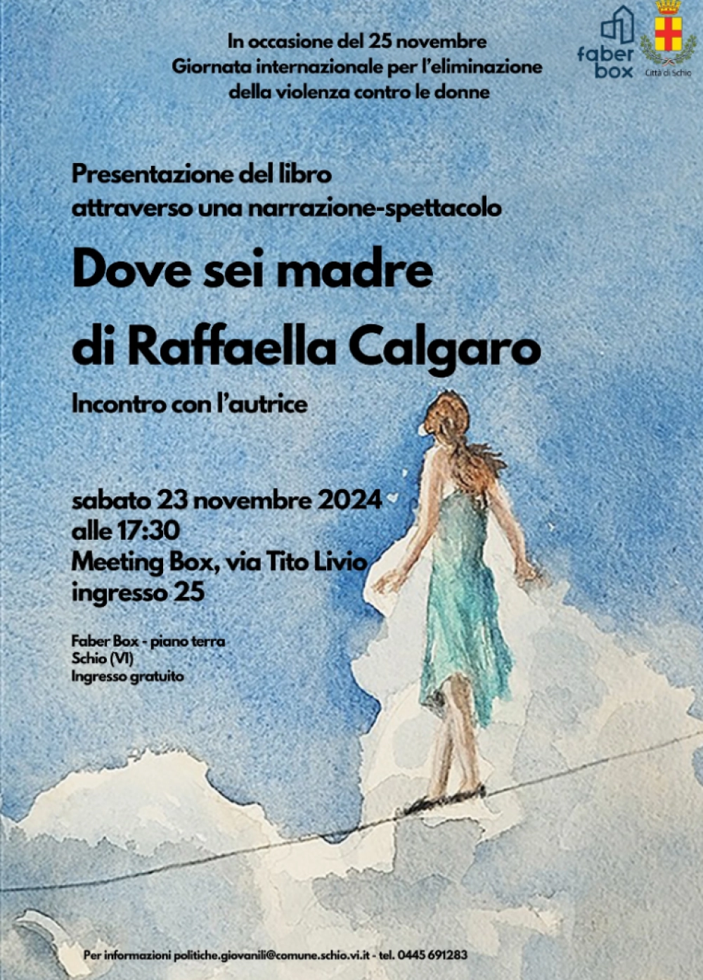 Sabato 23 novembre alle ore 17:30, presso gli spazi del Faber Box, si terrà la presentazione dell'ultimo libro di Raffaella Calgaro Dove sei madre, in dialogo con l'Assessore ai Servizi educativi e formazione continua, Politiche giovanili e Gentilezza Milva Scortegagna.