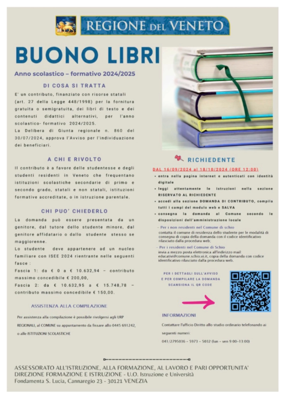 Si comunica che i genitori possono presentare alla Regione Veneto, a partire dal giorno 16.09.2024 alle ore 12.00 del 18.10.2024, la richiesta del contributo regionale “Buono-Libri 2024-2025”.