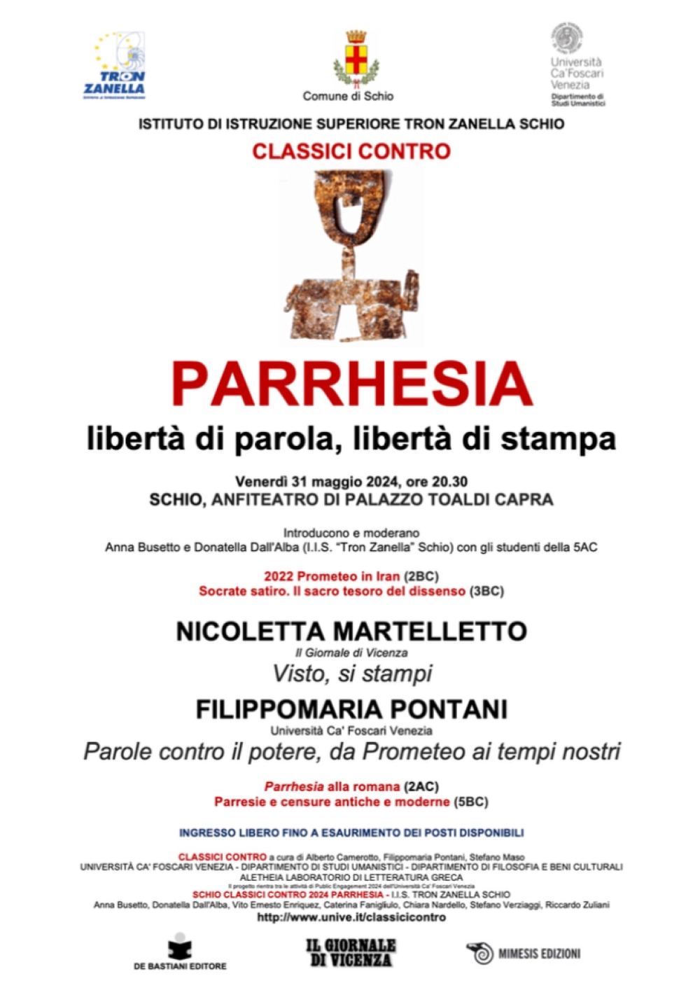 Pubblichiamo il poster per l'edizione 2024 dei Classici Contro, quest'anno con il titolo PARRHESIA - libertà di stampa, libertà di parola. L'evento è previsto per il giorno venerdì 31 maggio 2024, alle ore 20.30, presso l'anfiteatro di Palazzo Toaldi Capra.