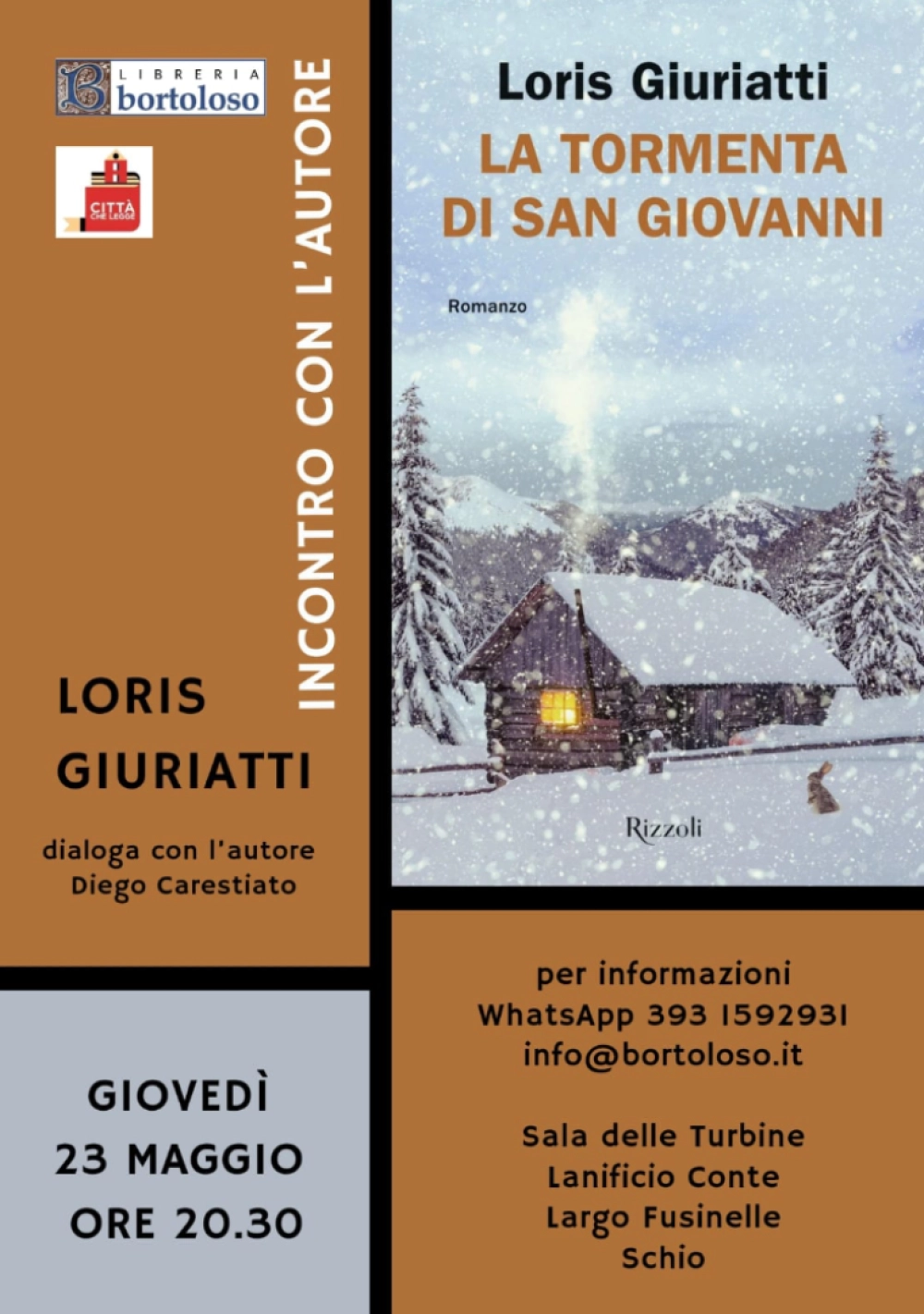Giovedì 23 maggio alle ore 20.30, presso la Sala delle Turbine del Lanificio Conte, si terrà la presentazione del libro La tormenta di San Giovanni, di Loris Giuriatti. Dialogherà con l'autore il prof. Diego Carestiato. L'ingresso è libero.