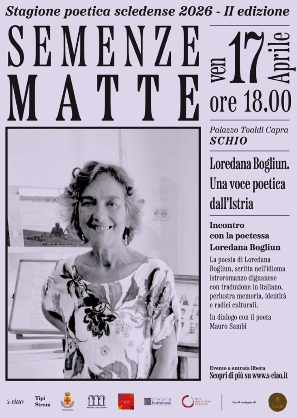 Si pubblica il poster della serata con la poetessa Loretta Bogliun, dal titolo "Una voce poetica dall'Istria", nell'ambito della rassegna "Semenze matte - Stagione poetica scledense 2026". Si precisa che l'incontro si terrà venedì 17 aprile alle ore 18.00 presso il palazzo Toaldi Capra a Schio.
